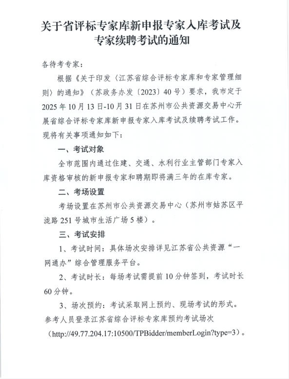 《關于蘇州市2025年度江蘇省綜合評標專家庫新申報專家入庫考試及專家續聘考試的通知》