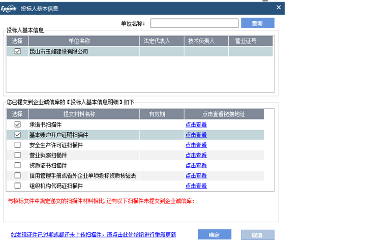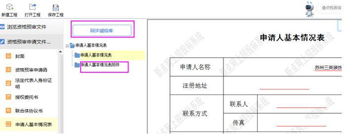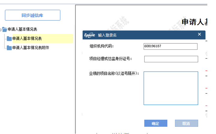 【申請人基本情況表】包含【申請人基本情況表】和【申請人基本情況表附件】兩個節點,其中,【申請人基本情況表附件】需從企業誠信庫中同步本單位證照等相關掃描件,請點擊‘同步誠信庫’按鈕,輸入基本信息,獲取誠信庫中的企業證照、項目經理證照、業績掃描件等。