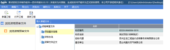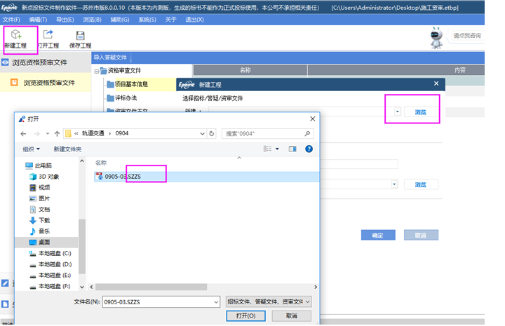 新建項目:點擊菜單欄上的文件>新建,或者點擊工具欄上的<新建工程>。點擊<瀏覽>選擇資審文件(*.SZZS格式)或者資審答疑文件(*.SZCS),點擊<打開>。在【創建新的工程文件】界面中投標工程文件的名稱是從資審文件中獲取的,然后點擊工程文件存放路徑的瀏覽按鈕,會彈出保存緩存件(*.etbp格式)的存放位置,請自行選擇保存位置并牢記位置,點擊確定即新建完成,進入投標文件制作界面。