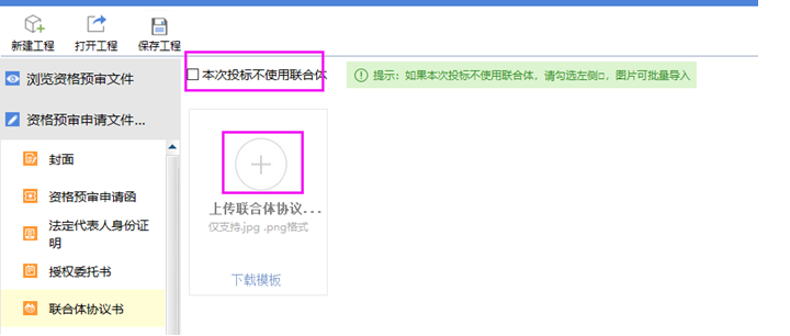 點擊【聯合體協議書】節點,點擊<+>按鈕,可以上傳jpg和png格式的掃描件,如果招標文件中提供了聯合體協議書模板,則可以點擊<下載模板>按鈕進行模板下載。