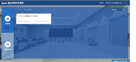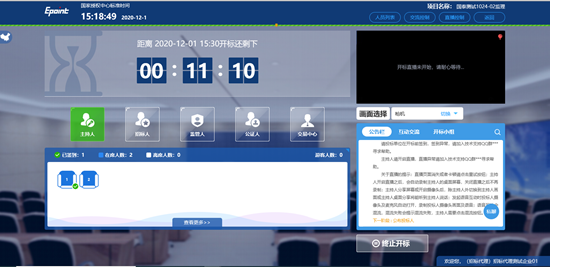 登入系統后可看到自己待開標的項目,選中需要本次開標的項目即進入該項目的直播間。頁面顯示開標倒計時和投標人在線及簽到情況。