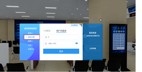 用IE瀏覽器打開昆山不見面開標系統,選擇“招標代理”,通過CA或者賬號密碼登錄系統(賬號為博浪業務系統賬號)。
