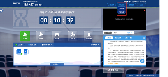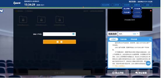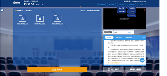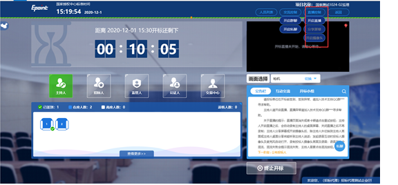 代理根據需要開啟直播、屏幕分享、電腦攝像頭。開啟直播后開標室監控畫面開始對外直播;開啟畫面分享后,開標電腦桌面對外分享;開啟電腦攝像頭后,開標電腦攝像頭畫面對外直播。