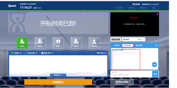 代理根據需要開啟或關閉交流互動功能。交流控制開啟后,可在“互動交流”進行文字交流(公布投標人之前,投標人無法發言)。代理也可在“開標小組”進行相關文字通知。