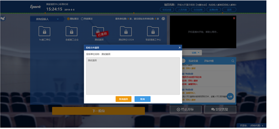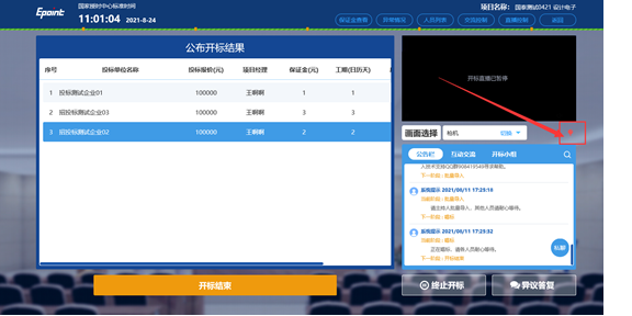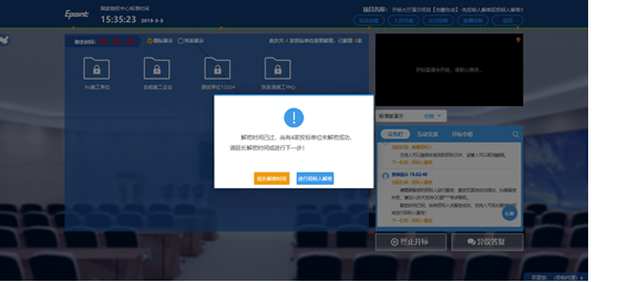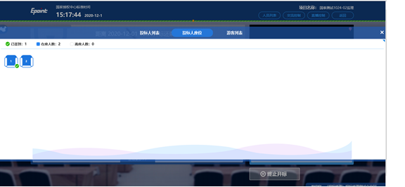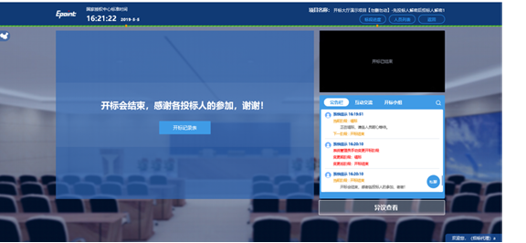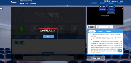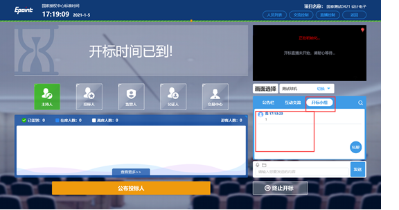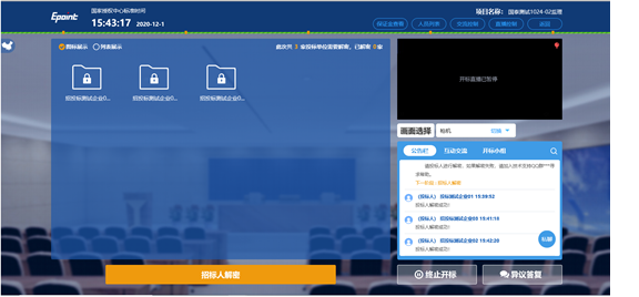 注意:開標結束的同時系統停止對外直播、停止桌面分享,請確認需要向投標人展示環節均已展示完畢,再點“開標結束”按鈕(例如K值等參數抽取)。