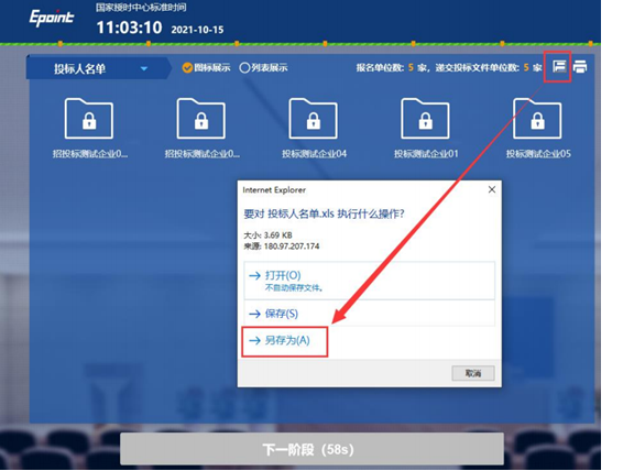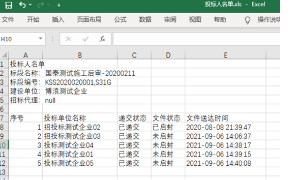 也可把投標人名單列表以excel形式導出,排序方式不變(根據投標文件送達先后順序進行排序),名單列表導出excel只可在此環節執行,其他環節不顯示導出按鈕。建議將導出的excel文件另存到電腦上再打開,直接打開可能會由于電腦性能問題導致打開失敗、電腦崩潰。