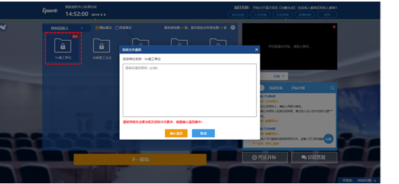 點擊投標人右上角“退回”按鈕可退回其文件,被退回的文件會在圖標上顯示“已退回”,點擊被退回文件可撤銷退回。標書退回可在名單展示、監管人解密、投標人解密、招標人解密環節執行(招標人解密前可退回,招標人解密后無法退回),進入其他環節系統將無法再執行此操作。