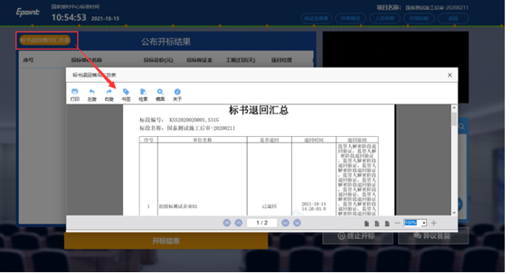 唱標頁面“標書退回情況匯總表”按鈕,可打印標書退回情況。