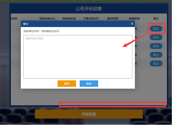 操作方法:將唱標頁面滾動條滑動到最右側,點擊“備注”按鈕,填寫備注內容,點擊“保存”按鈕,完成備注操作。