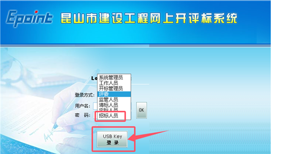 1、登錄方式選擇“招標人員”類型,插入招標人CA點擊“登錄”按鈕完成系統登錄。