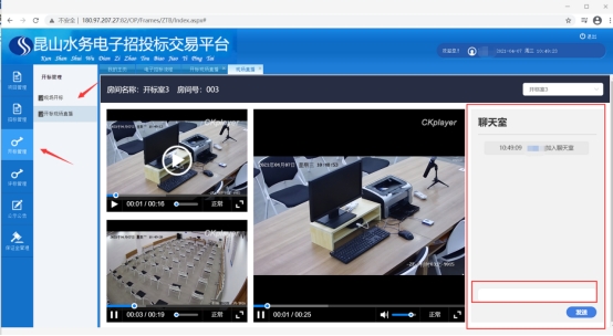 在開標現場直播界面,可以查看到開標現場、招標代理電腦界面,招標代理和投標人可以在開標現場互動,招標代理擁有發言控制權限。